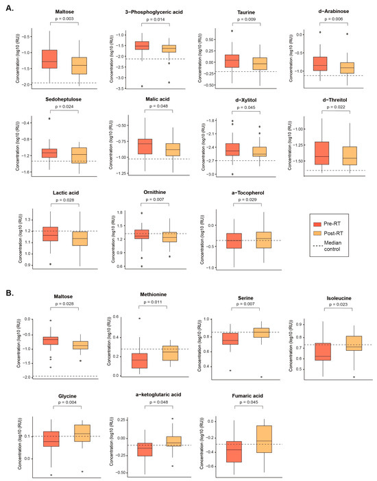 This figure illustrates metabolites that exhibited significant changes after treatment compared to pre-RT values with either (A) stereotactic body radiation therapy or (B) Conventional Fractionated Radiotherapy. Statistical significance was determined using the Wilcoxon signed-rank test. The dashed line indicates the median metabolite value for healthy volunteers. Results are presented as the log10 of Relative Units (RU).