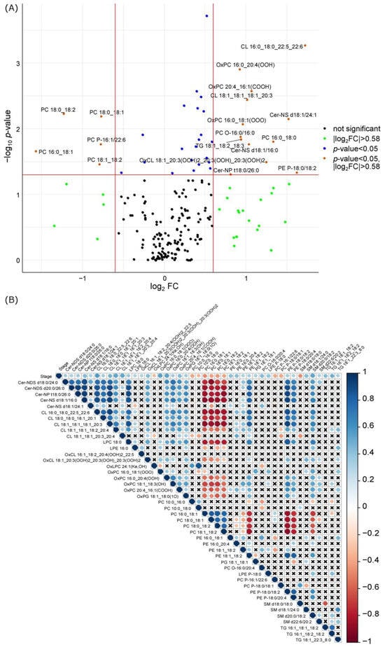 The association of the dried menstrual blood spot lipids with endometriosis. (A) A volcano plot of lipids detected in the dried menstrual blood spots. Orange color marks lipids with statistically significant differences between groups studied (p-value < 0.05, Mann–Whitney test) and a median fold change greater than 1.5 is labeled. (B) Correlation diagram of the lipids with the severity of endometriosis (stage) (p < 0.05). X represents the absence of a significant association. Cer-NS—ceramide, Cer-NP—physphingosine ceramide, CL—cardiolipine, oxCL—oxidized cardiolipins, PC—phosphatidylcholine, PC O—plasmanylphosphatidylcholines, PC P—plasmenylphosphatidylcholines, oxPC—oxidized phosphatidylcholines, PE P—plasmenylphosphatidylethanolamine, LPE P —plasmenyllysophosphatidylethanolamine, PG — phosphatidylglycerol, TG —triacylglycerol.