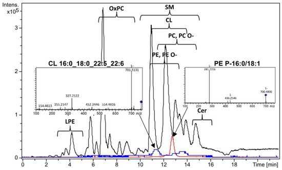 Base peak chromatogram (black), extracted ion chromatogram of PE P-16:0/18:1 (red) and extracted ion chromatogram of CL 16:0_18:0_22:5_22:6 (blue) with tandem mass spectra. Extracted ion chromatogram of CL 16:0_18:0_22:5_22:6 is scaled five times. Negative ion mode.