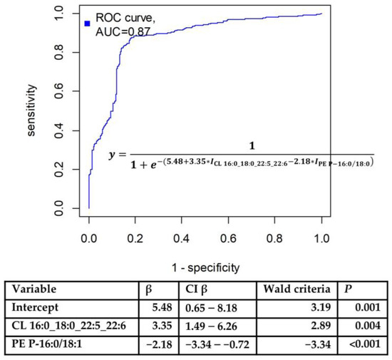 In the OPLS model utilized for feature preselection, the proportion of described dependent values was 63.2%, and the proportion of predicted dependent values was 42.2% (see Figure S3). The logistic regression model was finalized with the inclusion of cardiolipin CL 16:0_18:0_22:5_22:6 and plasmenylethanolamine PE P-16:0/18:1 (Figure 2) in the following equation: