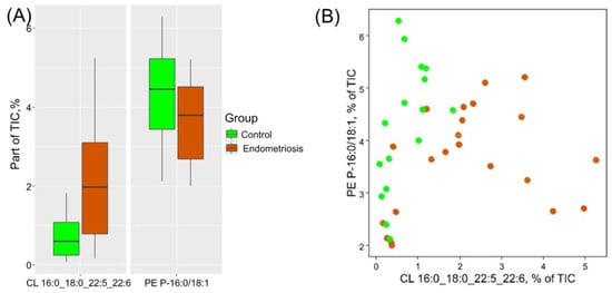 Diagnostic potential of plasmenylphosphatidylethanolamine PE P-16:0/18:1 and cardiolipin CL 16:0_18:0_22:5_22:6: (A) Boxplots illustrating the levels of these markers in menstrual blood; (B) dried menstrual blood spots plotted in the space of the relative proportion of plasmenyl-phosphatidylethanolamine PE P-16:0/18:1 and cardiolipin CL 16:0_18:0_22:5_22:6. The green points represent samples from the control group patients, while the ocher points represent samples from the endometriosis group.