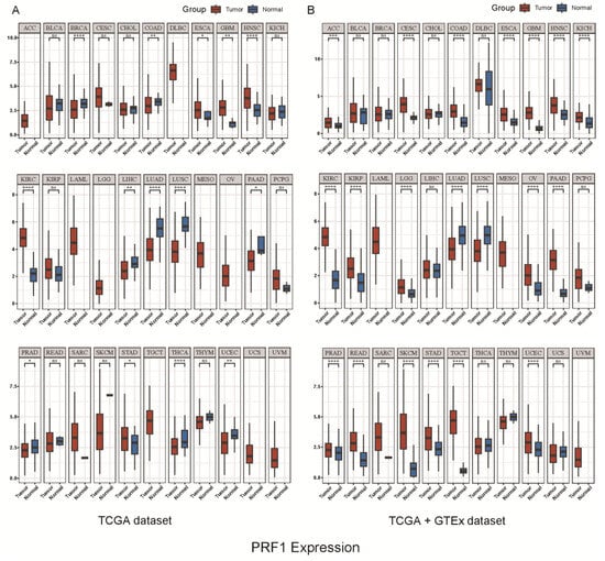 (A,B) TCGA dataset/TCGA+GTEx dataset: Distribution of PRF1 gene expression in tumor tissues and normal tissues, where the horizontal coordinates represent different tumor tissues and the vertical coordinates represent the distribution of the expression of this gene, where different colors represent different groups, * p < 0.05, ** p < 0.01, *** p < 0.001, **** p < 0.0001, pand asterisks represent the degree of significance (* p). The significance of the two groups of samples was tested using a Wilcox test.