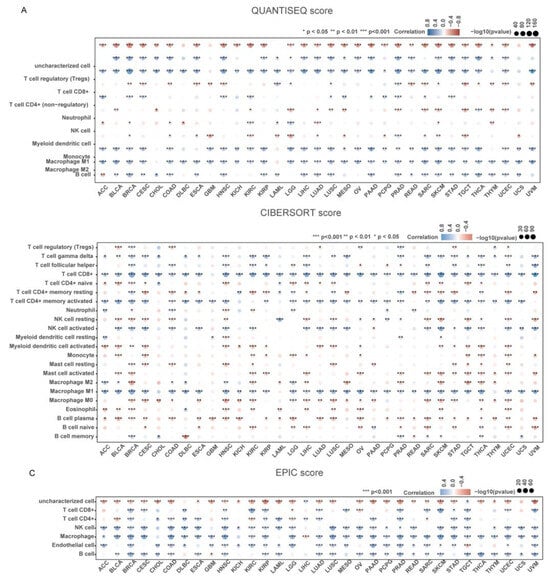 (A–C) Heatmap of correlation analysis between QUANTISEQ/CIBERSORT/EPIC immune infiltration score and Spearman’s correlation analysis of PRF1 gene expression in multiple tumor tissues, where the horizontal coordinates represent different tumor tissues, the vertical coordinates represent different immune infiltration scores, the different colors represent the correlation coefficients, the negative value represents negative correlation, the positive value represents positive correlation, and the stronger the correlation the darker the color, * p < 0.05, ** p < 0.01, *** p < 0.001, and asterisks represent significance (* p).