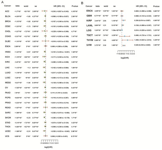 (A,B) Forest plot, results of one-way cox analysis of PRF1 gene in multiple tumors, p-value, risk coefficient of HR, confidence interval of HR, β-value, Wald value, and SE.