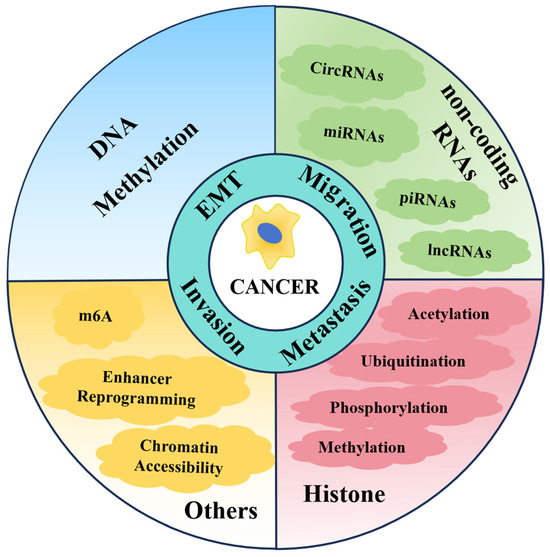 Despite the clinical importance of metastasis, much remains unknown regarding the molecular mechanisms underlying the metastatic process. Recent studies have identified the involvement of various epigenetic modifiers such as DNA methylation, histone modifications, non-coding RNAs, enhancer reprogramming, chromatin accessibility, and N6-methyladenosine in the proliferation and metastasis of cancer cells. These epigenetic modifiers have been shown to affect various signaling pathways, regulate transfer-related factors and proteins, and modulate the activity of transcription factors, suggesting that they are important therapeutic targets for cancer metastasis [7,8,9,10].