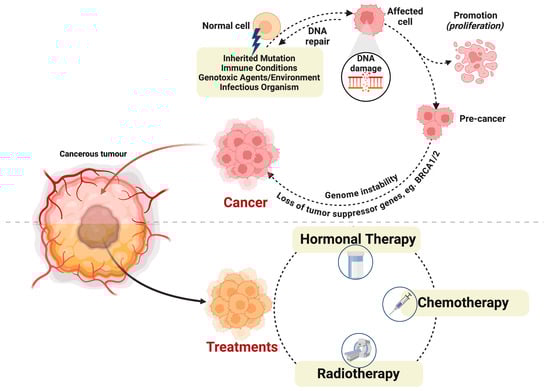 Cancer progression and treatment options. The figure illustrates the progression from normal to cancerous cells, detailing the factors contributing to DNA damage and subsequent cancer development. Inherited mutations, immune disorders, genotoxic agents, environment such as radiation, and infectious agents are shown as sources of DNA damage, initiating the formation of precancerous cells and promoting their proliferation. Key drivers like genomic instability and the inactivation of tumor suppressor genes, such as BRCA1 and BRCA2 (BRCA1/2), are depicted as crucial in cancer initiation. The figure also outlines cancer treatment options, including hormonal therapy, chemotherapy, and radiotherapy. BRCA1/2: Breast Cancer Susceptibility Gene-1 and -2. Created with Biorender.com.