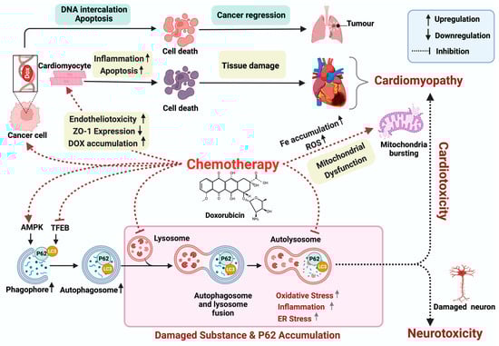 Chemotherapy-induced toxicity. This figure elucidates the repercussions of chemotherapeutic drugs on neuronal and cardiac systems. Specifically, doxorubicin (Dox) is portrayed as an agent that inhibits TFEB activity while stimulating AMPK, thereby fostering the upregulation of phagophore and autophagosome formation. However, Dox concurrently hampers lysosomal function and autophagosome maturation, leading to the accumulation of damaged substrates and p62. This accumulation exacerbates oxidative stress, inflammation, ER stress, and mitochondrial dysfunction, culminating in neuronal damage, thereby inciting neurotoxicity and contributing to cardiotoxicity. Additionally, Dox intercalates with DNA in cancer cells, leading to apoptosis and regression of cancer. Dox-induced cardiotoxicity primarily arises from mitochondrial dysfunction, characterized by elevated iron accumulation and increased reactive oxygen species generation. Dox promotes tissue permeability by inducing endothelial toxicity and inhibiting ZO-1 expression, which intensifies drug retention within cardiac tissues. Consequently, this provokes inflammation, apoptosis, tissue degeneration, and, ultimately, cardiomyopathy. The figure illustrates how the inhibition of autophagosome and lysosome maturation by Dox exacerbates cellular damage and dysfunction, amplifying the pathogenesis of neurotoxicity and cardiotoxicity. The accumulation of damaged substances and p62 further highlights the dysregulation of autophagy and its contribution to cellular pathology, including mitochondrial dysfunction, which further exacerbates cardiotoxicity. Dox: Doxorubicin, ROS: Reactive Oxygen Species, p62: Sequestosome 1, TFEB: Transcription Factor EB, AMPK: AMP-activated Protein Kinase, ZO-1: Zonula Occludens-1. Created with Biorender.com.