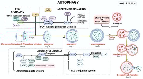 Autophagy is a highly conserved cellular process involved in the degradation and recycling of damaged organelles and proteins, thus playing a crucial role in maintaining cellular homeostasis [87]. Dysregulation of autophagy has been implicated in various pathological conditions, including cardiovascular diseases [88,89,90], neurodegenerative diseases [91], cancer [92], metabolic disorders [93], and infectious diseases [94]. This tightly regulated process culminates in the formation of autophagosomes, which are double-membraned vesicles that ultimately fuse with lysosomes. This fusion allows for the degradation of protein aggregates and dysfunctional organelles, promoting cell survival. The maturation of autophagosomes involves several coordinated steps, including initiation, elongation, maturation, fusion, and degradation—all tightly governed by signaling pathways and protein complexes to ensure an efficient and selective breakdown of cellular components [95] (Figure 3). Initiation begins with the formation of the phagophore, facilitated by the activation of Unc-51-like kinases (ULKs). The activity of ULK is modulated by mTORC1, which is a nutrient sensor. Under conditions of nutrient abundance, mTORC1 activation suppresses autophagy initiation. Conversely, during nutrient deprivation, autophagy is activated by the inhibition of the mTORC1 [96]. AMPK, an energy sensor, activates autophagy by inhibiting mTORC1 [97,98,99]. Autophagy process requires two ubiquitin-like conjugation systems: the ATG12-ATG5-ATG16L1 complex and the microtubule-associated protein 1A/1B-light chain 3 (LC3) system [100]. The ATG12-ATG5-ATG16L1 complex is crucial for the lipidation of LC3 as it covalently attaches ATG3 to LC3 [101]. LC3 is processed by ATG4 and conjugated to phosphatidylethanolamine (PE) to form LC3-II, which is integrated into the autophagosome membrane by the E3-like complex to support its expansion and closure [102]. During the maturation step, the original phagophore develops into a fully matured autophagosome, supported by the recruitment of more LC3-II and the closing of the phagophore to produce a double-membraned autophagosome, which then fuses with lysosome for degradation (Figure 3) [103].