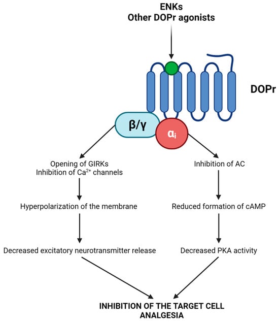 Signal transduction initiates when ENKs bind to DOPr, prompting the dissociation of the Gαi and Gβγ subunits (Figure 2) [54,55,56]. The Gαi subunit inhibits adenylyl cyclase (AC), resulting in decreased cAMP formation and subsequently reduced protein kinase A (PKA) activity [54,55,56]. Gβγ leads to the opening of G-protein-gated inwardly rectifying K+ channels (GIRKs; inducing membrane hyperpolarization) and decreases Ca2+ influx by binding to numerous types of Ca2+ channels (causing decreased neurotransmitter release) [54,55,56]. The consequence is the inhibition of the target cells and/or the induction of analgesia [52,53,54,55,56].