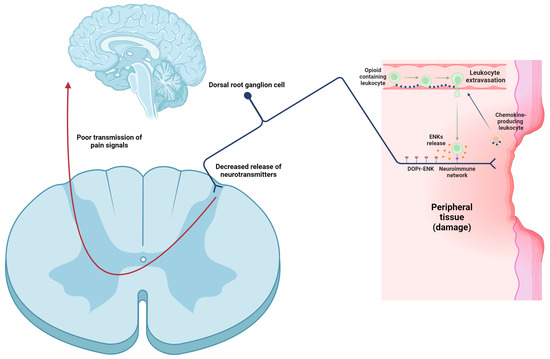 In inflammatory conditions, immune cells containing opioids (ENKs, among others) migrate to the inflamed tissue and secrete their content [118]. Several molecules can initiate the release of opioid peptides from immune cells, like noradrenaline (NA) [119], interleukin-1β (IL-1β) [120], CRF [120], CCL4 [121], and CXCL8 (IL-8) [122]. Next, opioid peptides pass through the damaged perineurial sheath and activate opioid receptors, located at the peripheral endings of primary afferent neurons, resulting in analgesia [87,88,89]. ENKs block the release of glutamate, substance P, and CGRP from these neurons [87,88,89], thereby reducing the transmission of pain signals to higher brain centers (Figure 4). This modulation of pain signaling is crucial for decreasing the intensity and perception of pain.