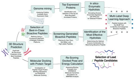 Comprehensive workflow for the identification and evaluation of BAPs from RNA sequence data to the final selection of the best candidate peptides. Genome mining: This initial step involves analyzing publicly available gene expression data to identify potential sources of BAPs; Top Expressed Proteins: Identification and selection of the top 50 most-abundant annotated proteins based on gene expression data. These proteins serve as the starting material for peptide generation; In silico Enzymatic Hydrolysis: Simulation of diverse enzymatic digestions using the RPG tool to cleave the selected proteins into smaller peptides; Multi-Label Deep-Learning Approach: Application of the Multi-Label Deep-Learning Tool (MLBP) to analyze the generated peptides, identifying and categorizing them based on their potential bioactivities; Identification of the Most Effective Hydrolysis: Determining the optimal enzyme combinations that maximize the production of BAPs; Screening Generated Bioactive Peptides: Filtering the generated peptides to select those that are non-toxic, non-bitter, and highly stable, ensuring the identification of safe and effective candidates; Selection of Best-in-Class Bioactive Peptides: Refining the selection of peptides using a consensus approach involving multiple prediction platforms to identify the most promising BAPs; 3D Structure Prediction: Using PepFold4 to predict the 3D structures of the best candidate peptides, providing insights into their spatial configuration and potential interactions. Molecular Docking with Protein Target: Investigation of peptide-target protein-binding interactions via FRODOCK molecular docking, which helps to assess the affinity and specificity of peptides for their target proteins. Re-Scoring Docked Pose and Energy Calculation: Assessing binding energies using GROMACS molecular dynamics simulations and MMPBSA analysis to evaluate the stability and strength of peptide–protein interactions; Selection of Lead Peptide Candidates: Based on the preceding analyses, the most promising peptides are selected as lead candidates for further experimental validation and potential therapeutic development.