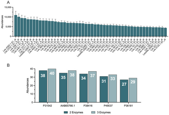 Protein analysis of S. lycopersicum Line27859 peel. (A) The panel shows the abundances of the top 50 expressed and annotated proteins in the peel of Solanum lycopersicum Line27859. Each bar corresponds to a specific protein, identified by its annotation code, with the height of the bar indicating the abundance level of the protein. The error bars represent the standard deviation, reflecting the variability in the data. (B) The panel illustrates a comparison of the number of peptides generated from the top five most abundant proteins using combinations of two and three enzymes. Each bar represents the number of peptides produced, with dark blue bars indicating the use of two enzymes and light blue bars indicating the use of three enzymes. The annotation codes of the top five proteins are listed along the x-axis (e.g., P31542, AAB65766.1), and the number of peptides generated is indicated at the top of each bar.