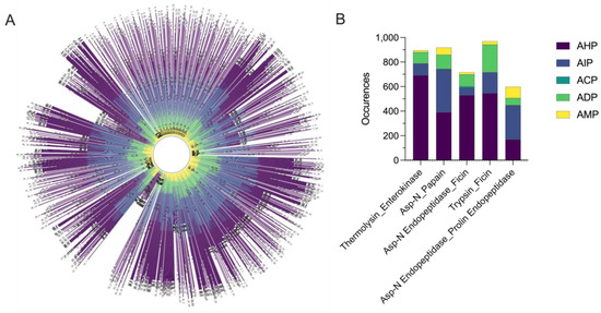 From the candidate pool of 1560 combined enzymes, five were shortlisted based on their maximum numbers of predicted bioactivities in various functions, including anticancer (ACP), antidiabetic (ADP), antihypertensive (AHP), anti-inflammatory (AIP), and antimicrobial (AMP) functions (Figure 3B). This analysis serves to identify the optimal enzyme combinations for maximizing peptide diversity and tailoring peptide properties for specific downstream applications. Results showed that each class of BAPs is enriched in the following specific enzyme combinations: ACP: Asp-N Endopeptidase_Ficin (n = 10); ADP: Trypsin_Ficin (n = 224); AHP: Thermolysin_Enterokinase (n = 692); AIP: Asp-N_Papain (n = 351); and AMP: Asp-N Endopeptidase_Prolin Endopeptidase (n = 91) (Figure 3B, Table 2).