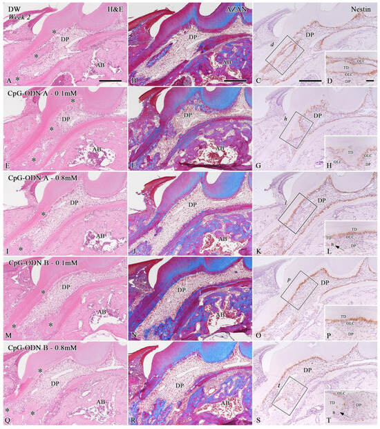 3.1. Histological Evaluation of the Dental Pulp Healing Process by H&E and AZAN Staining and Nestin Immunohistochemistry