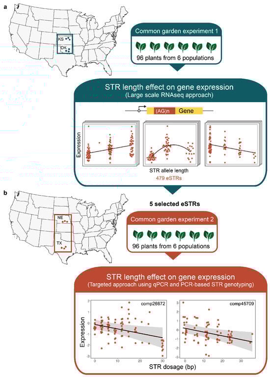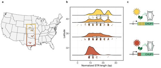 Previously, using an RNA-Seq approach, we identified 479 STRs linked to gene expression (hereafter referred to as significant expression STRs or eSTRs) in natural sunflower (Helianthus annuus L.) populations across a well-defined cline from Kansas to Oklahoma [14] (Figure 1a). A population genetic study conducted on sunflower populations along the same cline revealed that some eSTRs may be under directional selection [26]. In the current study, we use a targeted approach to study five selected eSTRs (of the 479) located in potential candidate genes for adaptation in sunflowers. We explore the relationship between eSTR length and gene expression in sunflower populations across a broader latitudinal range with populations further north and south of the focal population used in [14] (Figure 1b). Further, we explore the extent to which eSTR variation is shaped by the environment by assessing the correlation between eSTR length and latitude. Our results show that an eSTR located in a gene involved in chloroplast movement (CHUP1) is significantly associated with gene expression. In the CHUP1 gene, we show that shorter eSTR lengths, particularly favored in southern latitudes, are linked to higher expression levels. Finally, we explore these results in the context of the adaptive landscape of sunflower evolution across this well-defined cline [27,28,29].