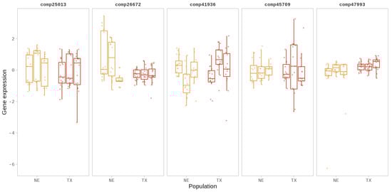 Gene expression variation in the five eSTR-containing genes across the sunflower populations from Nebraska (NE) and Texas (TX) used in the study (Supplemental Table S12). A total of 96 individuals representing the six populations (16 individuals per population) were used in the study.