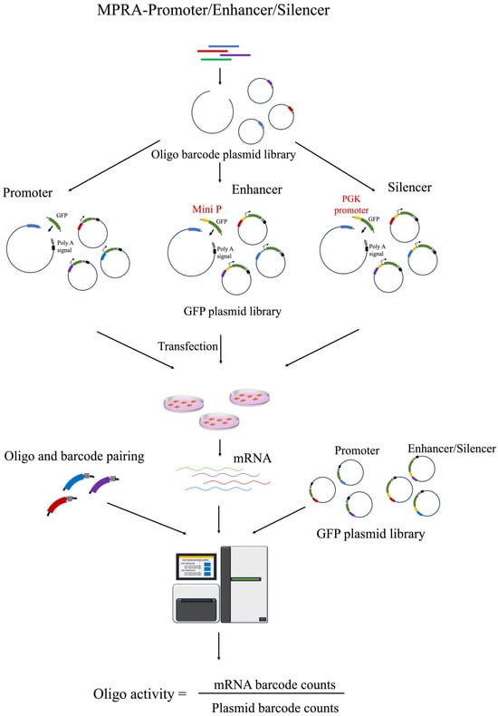 The dual-luciferase reporter system is revered as a gold standard for quantifying CRE activity but is hindered by its low throughput, which is inadequate for the demands of the big data era. Inspired by dual-luciferase plasmid constructs, the MPRA system has been engineered for high-throughput functional interrogation of regulatory elements. MPRA utilizes specific plasmid backbones and regulatory element activity detection strategies based on the functional principles of different regulatory elements. The target genomic fragments are inserted into appropriate screening plasmids, and the CRE activity of a fragment is evaluated by measuring either the transcriptional expression abundance of the tag information paired with the fragment or the transcriptional expression abundance of the fragment itself [33,34,35]. Below, we will detail how researchers use MPRA technology to identify the activity of CREs.
