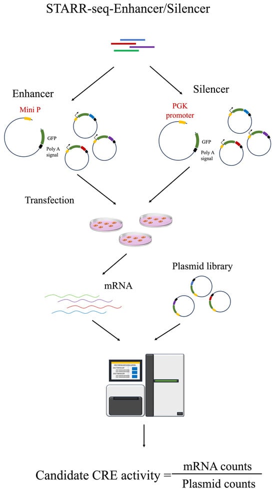 Silencers, akin to enhancers, exert regulatory functions irrespective of spatial and positional constraints and can be characterized through high-throughput methodologies such as STARR-seq. However, a critical difference lies in promoter selection: for enhancer identification, weak promoters or elements with inherently low promoter activity are preferred to enhance the sensitivity of detection [54,55]. Conversely, robust promoters, such as phosphoglycerate kinase (PGK) or super core promoter 1 (SCP1), are indispensable for the effective identification of silencers (Figure 1 and Figure 2). Jayavelu et al. employed a STARR-seq platform utilizing the SCP1 promoter to identify and catalog approximately 7500 potential silencing fragments across human and mouse genomes within K562 cell lines [56]. Further exploring this paradigm, Saadat Hussain used three distinct STARR-seq vectors incorporating SCP1, PGK, and the lymphoid-specific recombination-activating gene 2 (Rag2) gene promoter to evaluate silencer activity within mouse DNase I hypersensitive sites regions in T cell lines, revealing that more potent promoters, such as PGK and Rag2, are superior in detecting a greater number of silencers [57]. Hansen et al. applied ATAC-STARR-seq to a female B-cell lymphoblastoid cell line (GM12878) to concurrently assess the activity of both enhancers and silencers [44], a method that leverages the capacity of this system to detect dual regulatory elements within a singular experimental setup. Although using the ATAC-STARR-seq system to simultaneously identify enhancers and silencers is highly innovative, the promoter activity of the ORI element in the ORI-STARR-seq backbone is quite weak, which may result in some false positives when identifying silencers [58].