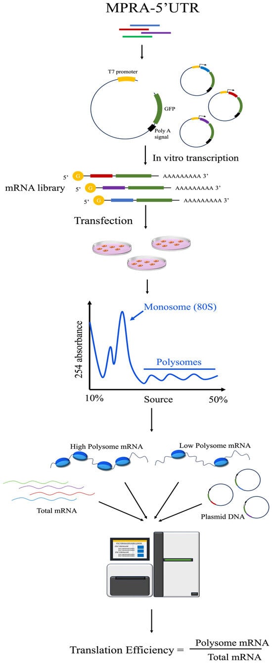 High-throughput identification of 5′ UTRs using the MPRA system. This strategy combines MPRA with in vitro transcription and ribosome component analysis to identify the impact of 5′ UTRs on the protein translation process.