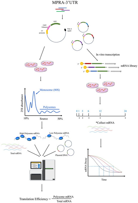 Contemporary MPRA systems, widely used for the high-throughput characterization of 3′ untranslated regions (3′ UTRs), adopt a configuration akin to the STARR-seq system. These assays strategically position test fragments downstream of a promoter and reporter gene and upstream of a poly A termination signal. Diverging from the STARR-seq framework, which employs relatively weak promoters for enhancer detection, MPRA systems for 3′ UTRs incorporate robust promoters to enhance transcriptional output. Oikonomou et al. implemented a dual-fluorescence system harnessing the strengths of GFP and mCherry, both driven by potent promoters. The test fragments were integrated downstream of the mCherry reporter gene, facilitating the identification of regulatory elements within the 3′ UTR via fluorescence-activated cell sorting [69]. Further advancements were made by Dustin Griesemer, who developed the MPRAu system using the strong PGK promoter to drive transcriptional machinery. This system was engineered to insert test fragments downstream of the GFP reporter gene, enabling evaluation of the functional impacts of 12,173 3′ UTR variants linked to human diseases and evolutionary traits across six distinct cell lines [70]. These plasmid-based configurations allow for a systematic analysis of the regulatory effects mediated by 3′ UTRs, offering a streamlined approach to genomic research. However, further investigations are necessary to elucidate the intricate dynamics of post-transcriptional mRNA translation and stability. The development of the Fast-UTR system, predicated on a bidirectional tetracycline-regulated viral reporter gene, has facilitated the quantification of the effects of 3′ UTR sequences on both mRNA and protein synthesis [71,72,73]. MPRA system is combined with in vitro transcription for high-throughput analysis of 3′UTR regulation of mRNA stability [71,74,75] (Figure 5).