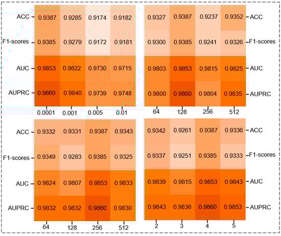 In this section, we investigated the sensitivity of parameters in GCGACNN, including the learning rate (LR) used during model training, the number of layers in GCN, the number of attention heads in GAT, the output channel sizes in the convolutional layers, and the feature dimensions for embedding. The overall results are illustrated in Figure 2. During the debugging process, we tested the learning rate (lr) within the range of {0.0001, 0.001, 0.005, 0.01}. As depicted in the figure, the model achieved optimal performance when lr was set to 0.0001, as shown in Table 3. For the convolutional layer’s output channel sizes, we conducted experiments within the range of {64, 128, 256, 512}. The graph illustrated that the model exhibited optimal performance when the channel size was set to 128, per the data depicted in Table 4. Exploring the impact of feature embedding dimensions, we varied the dimensions within the range of {64, 128, 256, 512}. The graph indicated that the model achieved its best performance when the feature embedding dimension was set to 256, according to the data presented in Table 5. Moreover, we examined the effect of the number of attention heads within the range of {2, 3, 4, 5}. As observed from the graph, the model performed optimally when the number of attention heads was set to 4, as shown in Table 6.
