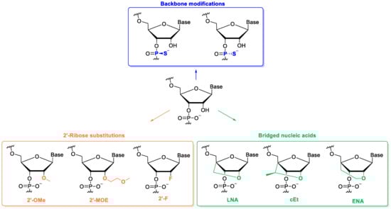 To enhance delivery, intracellular stability, binding affinity towards the target, and reducing their degradation by nuclease, ASO backbone, and/or sugar moieties are usually modified [20,29]. In this context, common modifications include the following: (i) phosphorothioate backbone incorporation, with the generation of a chiral center and two stereoisomers (Figure 1, blue square); (ii) modification at the 2′ position of the ribose sugar, e.g., introducing 2′-O-methyl, 2′-O-methoxyethyl or 2′-Fluoro moieties (Figure 1, orange square); (iii) or connecting the 2′ and 4′ carbon atoms of the sugar in different ways (Figure 1, green square), as in well-known locked nucleic acids (LNA).