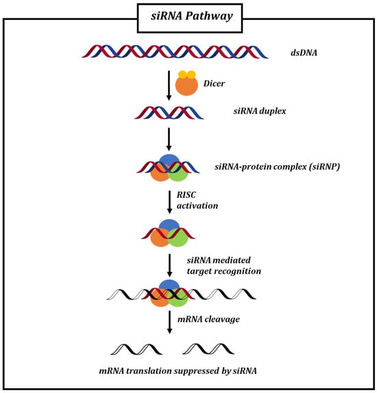 siRNA pathway: ribonuclease protein Dicer recognizes and cleaves DNA double-strand into small fragments (21–23 bp), known as siRNAs, which form the protein RISC complex. Then, siRNA binds the target sequence on mRNA, inducing its cleavage into small fragments (10–11 bp). This results in the suppression of mRNA translation.