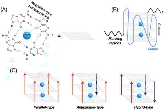 Schematic representation of (A) square-planar G-tetrad; (B) backbone of the intramolecular G-quadruplex structure; (C) G4 topologies: parallel-, antiparallel-, and hybrid-type G4 structures.