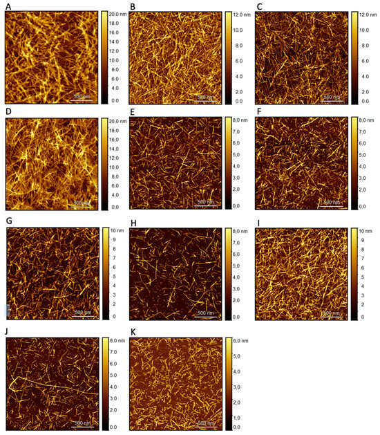 Solid-state AFM images of hIAPP with the tested compounds in a 1:1 ratio. Samples dissolved in HEPES pH 7.4 and incubated for 24 h at 25 °C. A 2 × 2 µm image of the formed fibrils for (A) Positive control and point of reference hIAPP 40 µM, (B) hIAPP and compound 1, (C) hIAPP and compound 2, (D) hIAPP and compound 3, (E) hIAPP and compound 4, (F) hIAPP and compound 5, (G) hIAPP and compound 6, (H) hIAPP and compound 7, (I) hIAPP and compound 8, (J) hIAPP and compound 9, (K) hIAPP and compound 10.