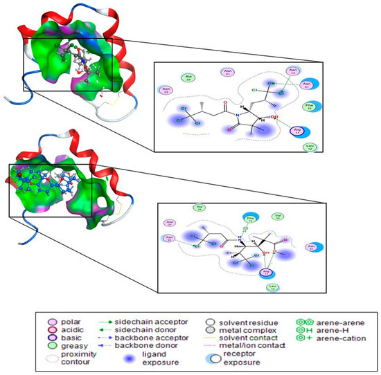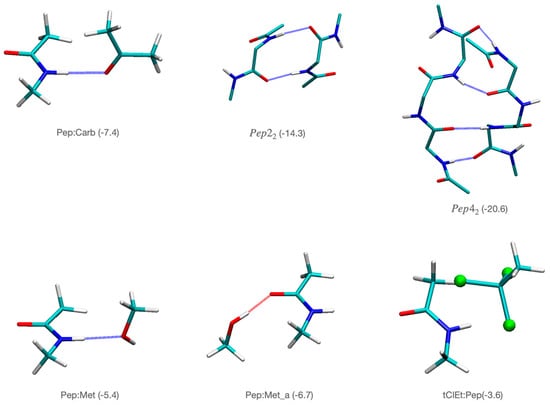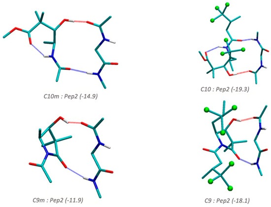 To analyze the inherent propensity of compounds 9 and 10 to interact with the backbone of the peptides, we performed accurate quantum chemical calculations summarized in Table 3 and Figure 5, Figure 6, Figure 7 and Figure 8. Figure 5 depicts the interaction energies between key functional groups of peptides and compounds 9 and 10. The interactions correspond to hydrogen bonds between different functional groups present in compound 9 or compound 10 and the peptide bonds. We observed many stabilizing hydrogen bond interactions between the peptide group and the carbonyl and hydroxyl functional groups present in compounds 9 and 10. Thus, the hydrogen bond between a carbonyl group and the peptide (Pep:Carb) is −7.4 kcal/mol, whereas the hydroxyl group presents two possible modes of interaction with high stabilizing effects, namely, −5.4 kcal/mol for the hydrogen bond interaction with the H-N side of the peptide bond (Pep:Met), and −6.7 kcal/mol with the carbonyl side (Pep:Met_a structure). Noteworthy, the presence of the chlorine atoms also leads to significant stabilization by interaction with the peptide π-bond, −3.6 kcal/mol. We also provide as reference the interaction energy of two glycine dipeptides interacting through hydrogen bonds in a β-sheet conformation (Pep22) with two hydrogen bonds accounting for −14.3 kcal/mol, whereas when we extend the model to cover tetrapeptides (Pep42), with four hydrogen bonds between the two chains the interaction energy is −20.6 kcal/mol.