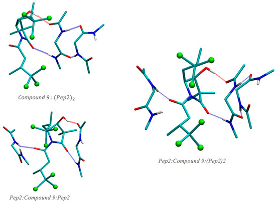 Therefore, compound 9, on the one hand, has the ability to interact with a Pep22 β-sheet structure without altering its intramolecular hydrogen bonding pattern, and in addition, provides an anchoring carbonyl group to interact with other chains. To confirm this, we calculated a Pep2: Compound 9:Pep22 structure. Energetics shown in Table 3 confirm the stability of such structures, with compound 9 having a high capacity to interact with the peptides.