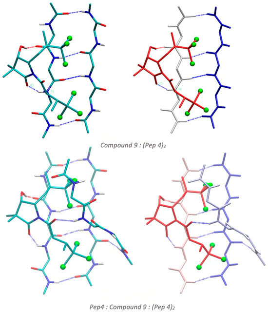 Finally, we extended our models to cover glycine tetrapeptides (Figure 8), optimizing two types of structures: (i) compound 9 interacting with two glycine tetrapeptides interacting in a β-sheet conformation (Compound 9:Pep42 structure), and (ii) compound 9 interacting with the Pep42 β-sheet structure and another Pep4 tetrapeptide chain opposite to the β-sheet, hydrogen bonded to the carbonyl group of compound 9 (Pep4: Compound 9:Pep42 structure). Energetics are shown in Table 3. As observed for dipeptides, there is a high capacity of compound 9 to interact with these tetrapeptide β-sheet structures by hydrogen bonds and interactions between the halogen atoms and the peptide π-bonds. Therefore, we obtain very favorable interaction energies that unequivocally show the capacity of compound 9 to interact with these peptides acting as an aggregating agent.