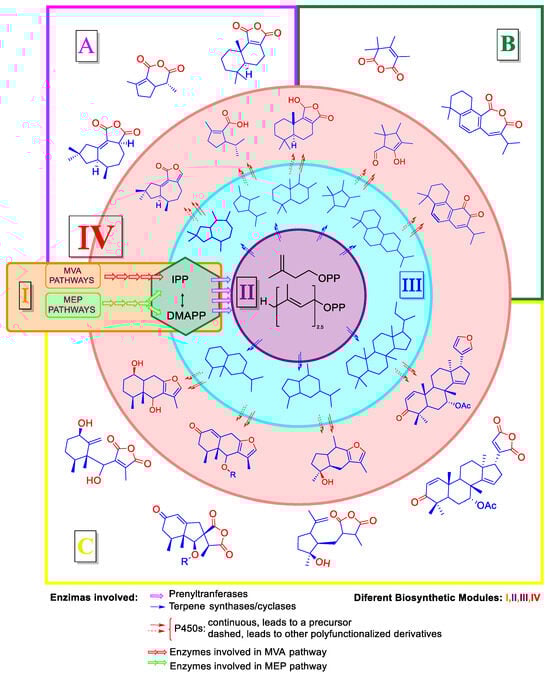 Phase I begins with the synthesis of the universal C5 terpene precursors isopentenyl diphosphate (IPP) and its isomer dimethylallyl diphosphate (DMAPP) (Figure 1). Pathways known as mevalonate (MVA) and methyl-erythritol 4-phosphate (MEP) are responsible for the synthesis of these building blocks [8,9,10,11]. In phase II, the formation of each of the acyclic prenyldiphosphates (PDPs) with different molecular size multiples of C5, takes place by condensation of one or several IPPs and DMAPPs and is catalyzed by prenyltransferases. This sequential elongation mostly complies with the so-called isoprene rule [12]. In phase III, the PDPs are transformed into a backbone of large diversity and complexity by the catalysis of terpene synthases (TPSs) and cyclases (TCSs) [13]. Phase IV is characterized by multiple changes in the organic functions of each terpene, mainly oxidation–reduction, and sometimes in the main backbone (cleavages, rearrangements, C-C bond formation). These processes are catalyzed in most cases by cytochrome P450-dependent oxygenases, monooxygenases and dioxygenases. This is the phase in which terpenoids possessing cyclic anhydrides originate, as well as highly functionalized terpenoids [14,15,16]. In this review, within phase IV, three different biosynthetic routes (routes A–C, Figure 1) leading to the formation of the cyclic anhydride cluster in terpenes have been considered. Each route is characterized by having a common precursor (structure or functions leading to the cyclic anhydride), and consequently, for each route the same transformations catalyzed by enzymes of the same nature will be repeated.