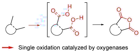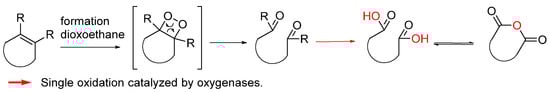 B1 occurs with the intermediate formation of dioxetanes, is used for the C-C double bond of olefins, enols, catechols, etc., and is catalyzed by dioxygenases. Intermediate dioxetane evolves rapidly by cycloreversion to dialdehyde, aldehyde + acid or diacid; in the first two cases, the aldehydes are further oxidized by monooxygenases to di-acid, then a water molecule is lost, giving the anhydride (Figure 3) [27].