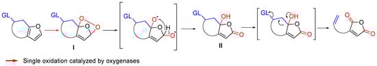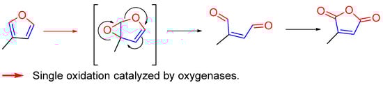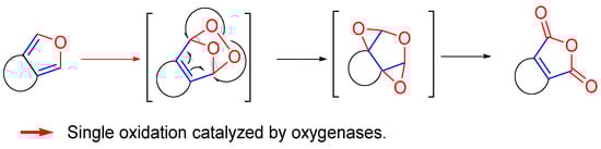 In natural furans, oxygen can be incorporated into the metabolic pathway to anhydrides by oxidases, generating a monoepoxide. The mono-epoxy type intermediates are labile and are transformed into dialdehyde by rearrangement. On the dicarbonyl, the action of monooxygenases leads to the formation of di-acid (Figure 5) [30,31].