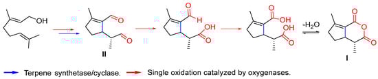 Secoiridoid anhydride I, isolated from the plant Stachys viticina, represents a clear example of a cyclic anhydride terpene that is formed following the type A pathway [25]. In this regard, chrysomelidial (II), an iridoid dialdehyde acting as a defensive toxin, has been isolated in the larvae of the beetle Phaedon cochleariae [26]. It was proposed that chrysomelidial (II) is a plausible intermediate in the formation of anhydride I and therefore, the biosynthetic pathway leading to both molecules should be analogous. Once generated, the chrysomelidial (II) compound undergoes two oxidations, one at each aldehyde being catalyzed by monooxygenases. The resulting carboxylic acid evolves by dehydration into anhydride I (Scheme 1).