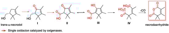The biosynthetic origin of necrodaanhydride (Scheme 2) is postulated in trans-α-necrodol, a component of the same plant, which is allyl-oxidized to ketoalcohol I. Further oxidation of the primary alcohol to carboxylic acid allows easy tautomerization to enol III, which undergoes degradation with dioxygenases, following the B1 pathway to IV. Finally, decarbonylation and dehydration give rise to the anhydride function of the necrodanhydride [28].