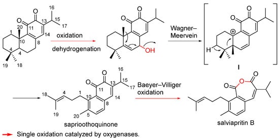The biosynthesis of salviapritin B has been postulated from the abietane miltirone, both natural products having been isolated from the plant Salvia prionitis (Scheme 3). Miltirone undergoes hydroxylation at C7 and dehydrogenation at the C5–C6 bond. When the hydroxyl group at C7 is removed, the C20 methyl undergoes a Wagner–Meerwein-type migration, giving rise to a carbocation I at C10. This highly unstable intermediate gives rise to saprioorthoquinone after cleavage of the C4–C5 bond, which results in the aromatization of the B-ring, and olefin formation at C3–C4 by proton elimination. Saprioorthoquinone, a natural product also found in S. prionitis, undergoes O-insertion catalyzed by Baeyer–Villiger oxygenases, giving rise to the cyclic salviapritin B anhydride. This type of anhydride formation is very common in terpenes, especially in diterpenes.