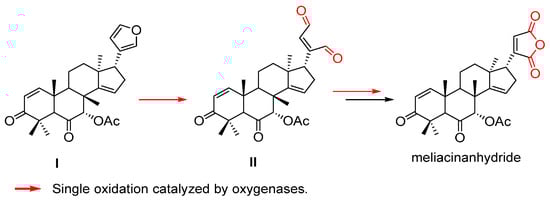 This type of formation of terpenic anhydrides occurs in very few cases, one of the few examples being the anhydride triterpenes with a limonoid skeleton present in Azadirachta indica. Thus, the biogenesis of meliacinanhydride (limonoid anhydride isolated from A. indica) should start from furan derivative I found in the same plant, via the C1 route. According to this proposal, furan I undergoes oxidation by monooxygenase (cytochrome P450) giving rise to the corresponding epoxide intermediate, which evolves into its respective cis-enedial II. This enedial undergoes oxidation at both ketone groups, producing dicarboxylic acid, which after dehydration evolves to the characteristic maleic anhydride fragment of the meliacinanhydride compound (Scheme 4) [30].