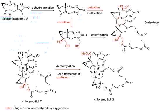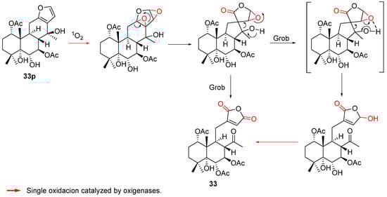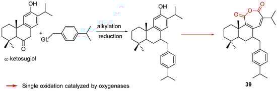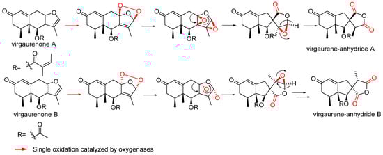 Oxidation is the chemical reaction that nature uses to generate a wide range of compounds from a single molecular backbone. Monooxygenases and dioxygenases are the enzymes involved in these chemical changes, and they are very versatile, being able to act once or several times on the same and different positions of the structure. A very high number of reactions in the biogenetic oxidation of terpenes are monooxygenation catalyzed by cytochromes P450 (P450s), a large family of “iron and heme-dependent monooxygenases”, and far from being the only ones, we also find oxidations mediated by nonheme iron-dependent oxygenases, the new radical superfamily S-adenosylmethionine (SAM), copper-dependent oxygenases (cytochrome c oxidase, laccase and tyrosinase), flavin-dependent monooxygenase (FMOs) or NAD(P)H-dependent reductases [17]. On the other hand, dioxygenases are constituted by several families of enzymes, the most relevant being lipoxygenases (LOXs), 2-oxoacid-dependent dioxygenases (2-ODDs) and diol-cleaving catechol dioxygenases. The last two are the most important in the biosynthesis of terpenic anhydrides [18,19]. This process is not exclusive to these enzymes and can also be catalyzed by biomimetic or bioinspired chemical reactions, which mimic, partially or totally, the action of the oxidase [20,21,22,23,24].