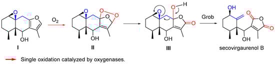 Secovirgaurenol B is an anhydride sesquiterpene isolated from the Chinese species Ligularia virgaurea. The biosynthesis of this compound has been postulated to start from sesquiterpenic furan I, which is oxidized to endoperoxide II. Intermediate II evolves to hydroxylactone III. This species possesses an appropriate 1,3-difunctionalization and finally undergoes a Grob-type cleavage, leading to C-8-C-9 bond breakage and the formation of the maleic anhydride moiety. This example clearly illustrates the C3 pathway proposed in this review (Scheme 6) [37].