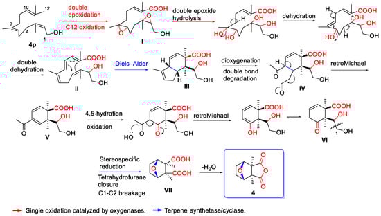 Upon this background knowledge, we postulate here a hypothetical biosynthetic route of cantharidin (4) from farnesol 4p, trying to shed some light on the degradative steps of the biosynthesis of this anhydride (Scheme 7). Three well-differentiated phases are proposed. In the first one, farnesol is functionalized to intermediate II, which has a suitable functionality to allow the construction of the key C4–C8 bond in the process. This phase involves enzymes known to be present in insects that biosynthesize cantharidine, in particular, those belonging to the insect juvenile hormone formation pathway (C–H bond oxygenases, epoxides, etc.) [84,88]. We hypothesize that the formation of both the double bond at C8–C9 and the allylic alcohol at C2–C4 are efficiently achieved via epoxides at C2–C3 and C6–C7, as in I. Thus, the opening of the C2–C3 epoxide with the elimination of H4 (hydrolysis to diol and dehydration of the tertiary hydroxyl could also be possible) and a similar process on the C3–C6 epoxide, with the elimination of alcohol at C5, leads to intermediate II. Additionally, the C12 methyl has also been oxidized to carboxylic acid.
