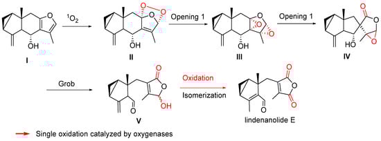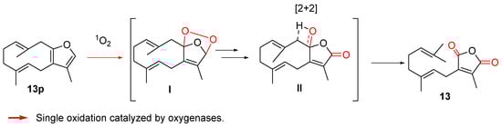 In 1984, Goren et al. isolated, from Smirnium rotundifolium, secogermacran 13, whose biosynthetic origin must be in furanodiene 13p [92] (Table 4). The reaction of 13p with singlet oxygen leads to endoperoxide I, which after the reductive opening of peroxo and oxidation at C13 produces the intermediate hydroxylactone II. For the last step involving the degradation of the germacrane skeleton, a pericyclic reaction is postulated, where -OH at C10 is protonate, with a concomitant carbonyl formation (Scheme 8). The same anhydride was found in the marine gorgonian coral organism Menella sp. (Plexauridae) at a depth of 100 m [93].
