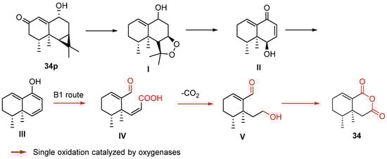 Pathway A, the most common and the one that generates most of these terpenic anhydrides, is the consequence of the successive and, if necessary, multiple oxidations of one or two methyls that are spatially close to each other in the carbon skeleton. The progressive oxidation of each one passes through alcohol and aldehyde to carboxylic acids (Figure 2). These reactions are carried out by the repeated action of monooxygenases on the same methyl. It is not necessary that the oxidation processes are simultaneous for both methyls, or that they act on both. They usually are not, so we define the pathway as the oxidation of methyls, hydroxymethyls or aldehydes to carboxylic acids, depending on which substrate we take as a starting point. The cyclic terpenic anhydride can be found in equilibrium with the carboxylic acid, which will be displaced to a greater or lesser extent towards one or the other function depending on the conditions (the pH of the medium, temperature, etc.). Spatial arrangement and angular tension permitting, the cyclic acid anhydride is usually favored.