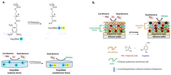 - Druvari, D.; Koromilas, N.D.; Lainioti, G.C.; Bokias, G.; Vasilopoulos, G.; Vantarakis, A.; Baras, I.; Dourala, N.; Kallitsis, J.K. Polymeric Quaternary Ammonium-Containing Coatings with Potential Dual Contact-Based and Release-Based Antimicrobial Activity. ACS Appl. Mater. Interfaces 2016, 8, 35593–35605. [Google Scholar] [CrossRef] [PubMed]