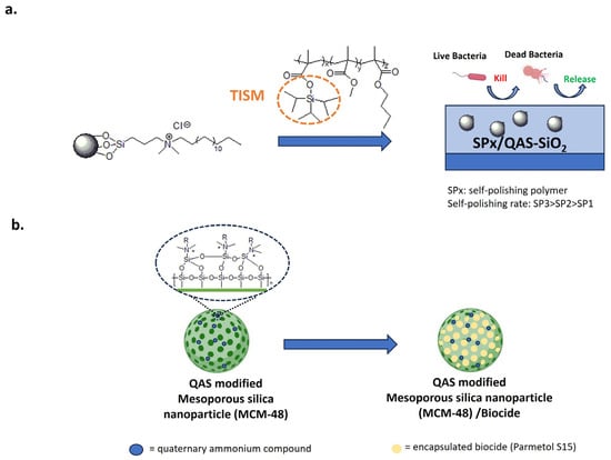- Wang, D.; Xu, J.; Yang, J.; Zhou, S. Preparation and synergistic antifouling effect of self-renewable coatings containing quaternary ammonium-functionalized SiO2 nanoparticles. J. Colloid Interface Sci. 2020, 563, 261–271. [Google Scholar] [CrossRef]