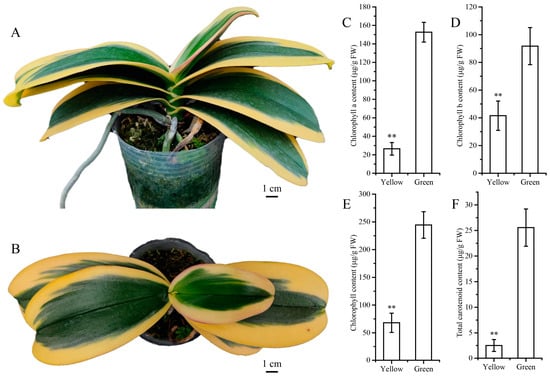 Phenotype characterization and pigment contents in the yellow and green regions of Phalaenopsis Chia E Yenlin Variegata leaves. (A,B) Phenotype of three-year Phalaenopsis Chia E Yenlin Variegata seedling. Chlorophyll a (C), chlorophyll b (D), total chlorophyll (E) and total carotenoid content (F) in the yellow and green region of leaves. Values are the mean ± standard deviation (n = 3). ** p < 0.01. Bar = 1 cm.