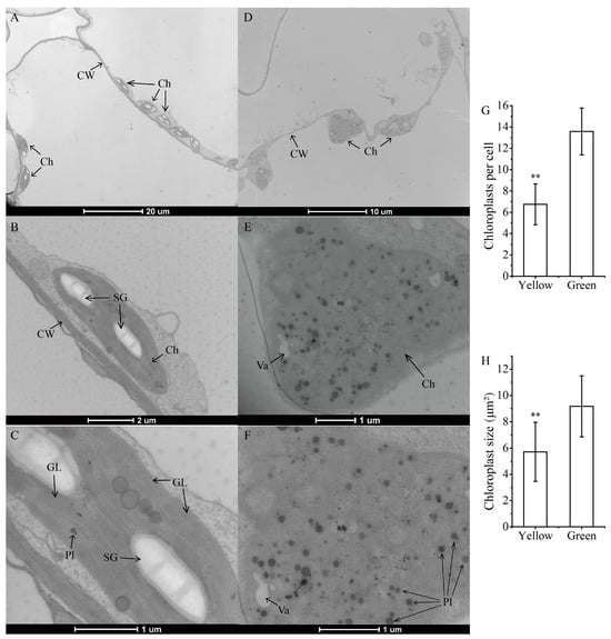 Transmission electron micrograph of chloroplast ultrastructure in different leaf-color regions. (A–C) Chloroplast ultrastructure structure of the mesophyll cells in the green region. (D–F) Chloroplast ultrastructure structure of the mesophyll cells in the yellow region. (G) Average number of chloroplasts per cell in the yellow and green regions. (H) Average chloroplast size in mutant leaves in the yellow and green regions. ** p < 0.01. Ch: chloroplast; CW: cell wall; GL: grana lamella; Pl: plastoglobuli; Va: vesicles; SG: starch granule.