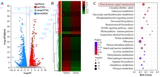 To elucidate the molecular mechanisms that contribute to the golden leaf coloration in Phalaenopsis, we performed transcriptome sequencing on a total of six samples of the YR and GR from the same leaf, using the Illumina platform. A total of 39.17 Gb of clean data was obtained after removing repetitive, low-quality, and adapter sequences. Both Q20 and Q30 values exceeded 97.93% and 94.26%, respectively, and the GC content ranged from 50.73% to 51.8% (Table S1). The total mapped ratio of each sample was more than 77.94% (Table S2) after the clean reads were compared with the Phalaenopsis equestris genome (Reference genome version: GCF_001263595.1). The gene expression correlation between each replicate showed a high coefficient (0.795–0.993) by principal component analysis (PCA) (Figure S1), providing evidence for the reliability of the sequence results. The transcriptome raw data have been uploaded in the National Center for Biotechnology Information (NCBI) database under accession number PRJNA1091187. A total of 23,206 expressed genes were detected, including 3670 new genes and 19,318 genes annotated in six public databases (GO, KEGG, COG, NR, Swiss-Prot, Pfam) (Figure S2). We screened for DEGs between the comparison of the yellow and green region (fold change ≥ 2, FDR < 0.05), and a total of 3793 DEGs were screened with 1769 upregulated and 2024 downregulated genes (Figure 3A,B). A KEGG enrichment analysis of DEGs revealed that the most significantly enriched pathway was ‘plant hormone signal transduction’ (54 genes, 25.7%), suggesting that plant hormones may play an important role in leaf yellowing.