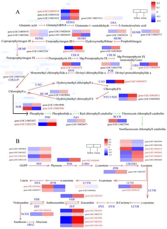 Expression profiles of genes involved in chlorophyll and carotenoid biosynthesis between different leaf-color regions. (A) Chlorophyll metabolism. The red and green arrows indicate the steps of Chlorophyll biosynthesis and degradation, respectively. (B) Carotenoid biosynthesis. DEGs were marked in red. The expression level was quantified from three biological replicates in the yellow and green regions, and the color bar indicates an increasing expression level from blue to red.